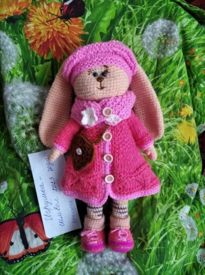 Здравствуйте! Давно хотела связать ушастую заиньку, спасибо конкурсу, подтолкнули к созданию игрушки - лапочки. Использовала разные нитки, спицы №3.5, крючки, чулочные спицы. Глазки купила готовые. Вышивала - пришивала иглой с большим ушком. Получилась заинька Розочка, я довольна. Выставляю на ваш суд, дорогие мастерицы.