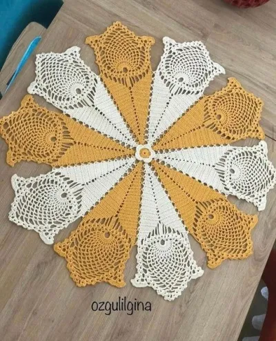 Материалы. Для вязания салфетки используется по 60 г белой и янтарной хлопчатобумажной пряжи (100% хлопок, длина 280 м на 50 г), крючок № 1,5.