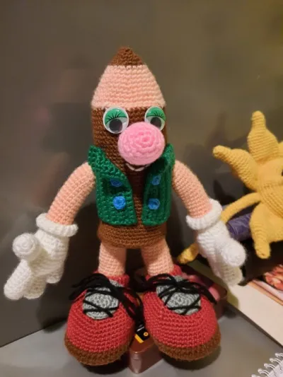 Мишки связаны из велюровой пряжи. Одежда снимается. Могут сидеть и стоять. В комплекте письменные принадлежности. Рост 15 см.