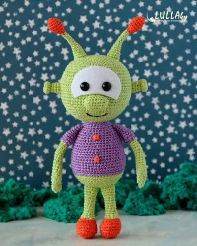 Вот Вы и связали самого, что ни есть, инопланетянина! Он может получиться абсолютно разным. Всё зависит от вашей фантазии. Можно использовать каркас на ножки и ручки или не использовать его совсем. Фетр на глазки также не обязательно делать. Можно приклеить глазки и вышить бровки. Если привязать юбочку и бантик, выйдет Зелемонечка. Вас ничего не ограничивает фантазировать и придумывать образ. Дерзайте!