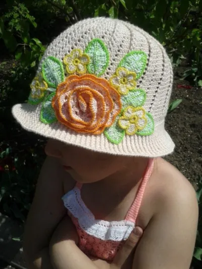 Сарафанчик тоже вязала ради интереса, а по итогу, дочь быстрее выросла, чем я довязала его))) Уж очень тоненькая ниточка, белые рюши - вообще связаны из катушечной швейной нитки )) Цветы и листики на панаме тоже из швейных ниток))