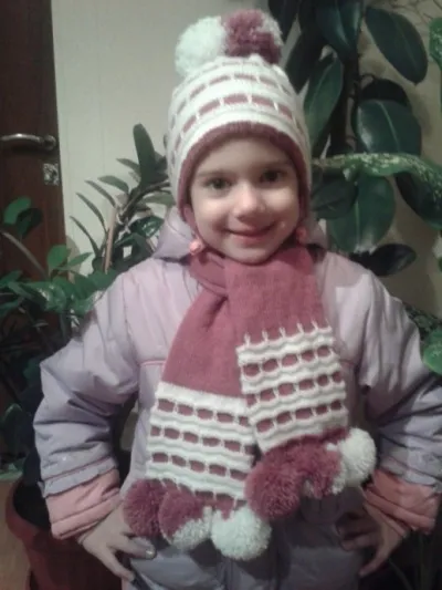 Вязала доче. Шапка двойная, шарф тоже двойной. Сообразила интересный тройной бубон/пампон на шапку и по три с обеех сторон шарфа)