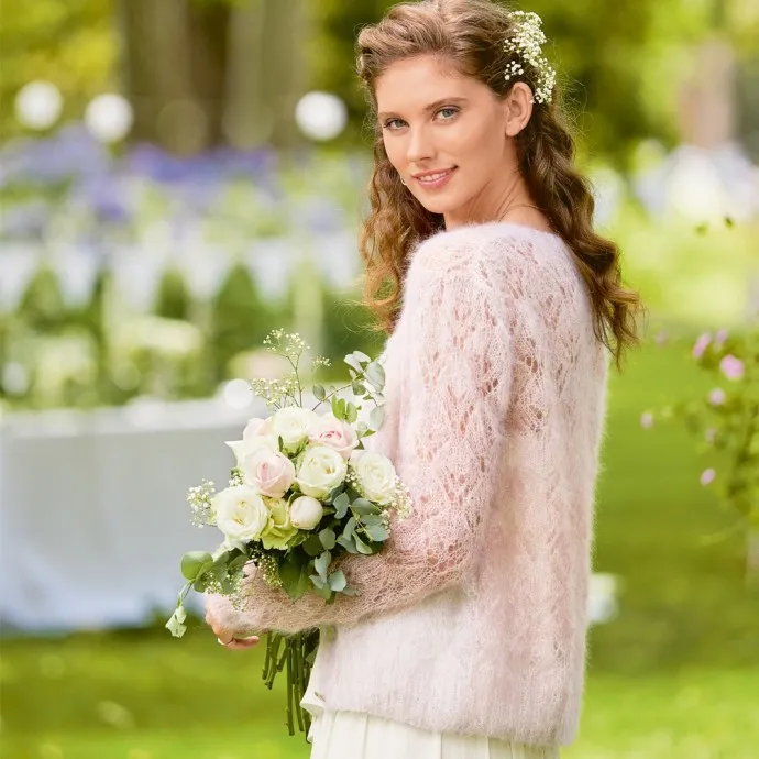 Легкий, словно перышко, ажурный жакет привлекает бело-розовой цветовой гаммой, которая деликатно подчеркивают красоту узора.