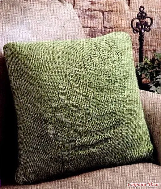 Рисунок листа вывязывается на верхней стороне подушки. Рисунок состоит из комбинации лицевых и изнаночных петель.