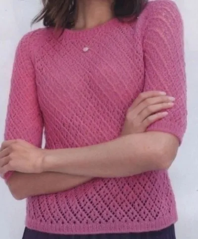 Спинку вязать аналогично переду. Спинку вязать до 33 (35,5, 38) см в высоту. Для реглана убавлять 2 (3, 4) п с двух сторон. С двух сторон вязать 3 лиц петли, остальные петли вязать ажурным узором.
