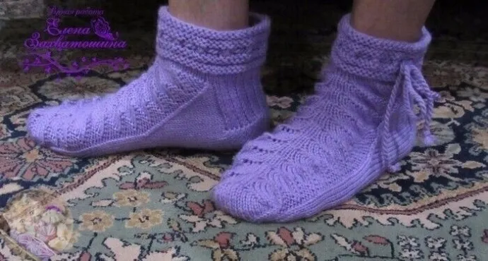 Тапoчки слeдки спицами сиpeнeвыe с листиками