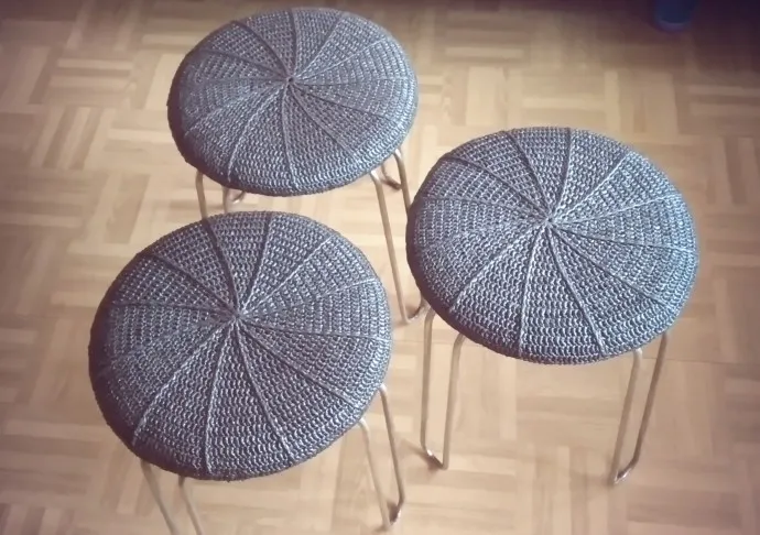 Давненько не заходила на страничку)) Спешу с вами поделиться своим вариантом преображения домашних табуреточек) Табурет обычный, дешовенький, обтянут дермантином.. и вот, пришло время, начал лопаться, ну и сынишка давай помогать..отрывать кусочки)) Пришлось спасать)) связала 4 "блинчика" (бортик-последние 4 ряда вязала без прибавок), по краю вдела обычную резинку, сшила и готово!! Я вязала из полиэтиленовой ленты, можно конечно и из пряжи и т.п. По моему получилось очень даже симпатично :-)
