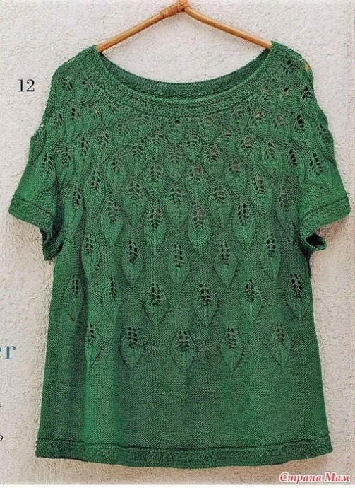 Футболка с круглой кокеткой и узором "листья" спицами