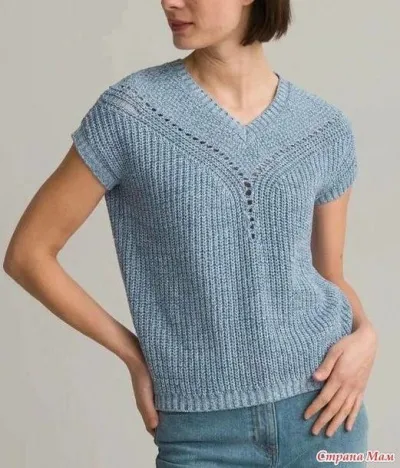 Но я бы сделала вырез горловины поглубже. И что-то неаккуратно смотрится ажурная полоска. Какая-то кривоватая. Над нею надо поработать.