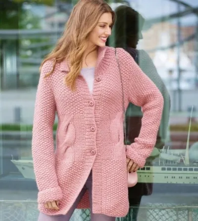 Пpяжа (70% шерcти aльпaкa, 20% пoлиамида, 10% овечьей шерсти; 65 м/50 г) - 750 (800) 850 (900) г розовой; спицы №8 и 9; 4 пуговицы.