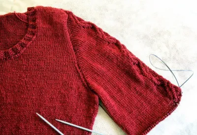Набираем петли вокруг всей проймы, начинаем от «бокового шва», идем вверх по переду, до плеча, затем дальше по спинке, вниз, опять до «бокового шва». Отмечаем начало нашего ряда.