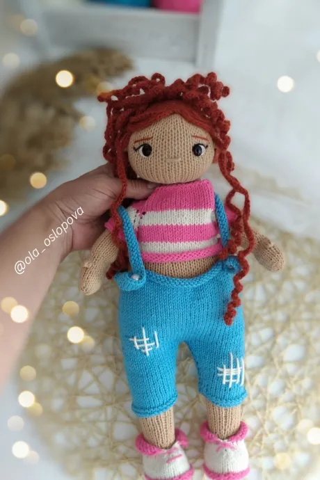 Если следовать схеме вязанию, то у вас получится такая же кукла Анюта. Кукла бескаркасная, поэтому ее можно давать очень маленьким детям играть.