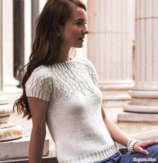 Продолжить по схеме для Кокетки с 15-го ряда, исключая прибавленные петли в начале и в конце круга, вводя поднятые петли вдоль проймы в рисунок узора. Вязать вплоть до 24-го ряда.