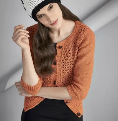 Пряжа (100% экстратонкой мериносовой шерсти; ок. 105 м/ 50 г) — 400 (450–500) 550 г = 8 (9–10) 11 мотков оранжевой; спицы №4 и 5; 5 пуговиц.