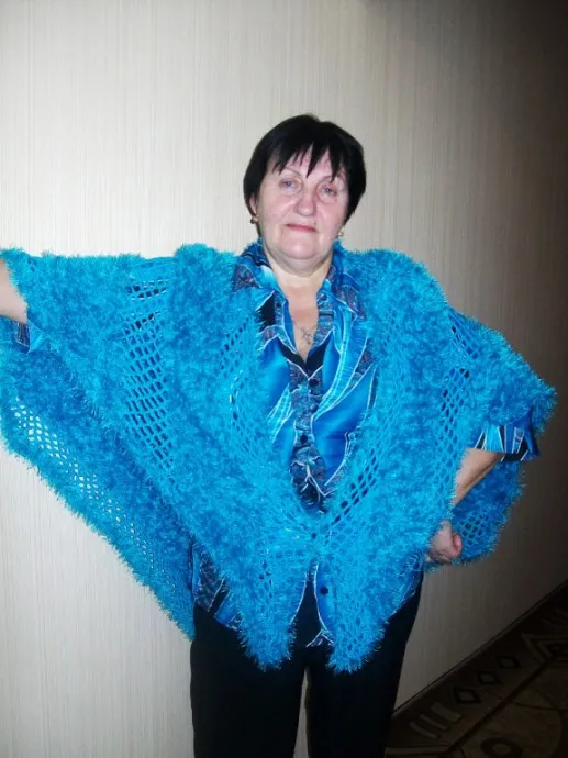 Маргарита! Ее вяжут почти как шаль. Но чтобы угол не был острым, я в самом начале вязки не в каждом ряду делала прибавления (это в середине ) к углу. Потому он не заострен сзади, как и на рукавах- тут нужно чутье мастерицы. А пряжа — на выбор из магазина. Ну, а ТРАВКА, по-моему, сегодня продается всюду. Несколько рядов вяжу сеточку из пяти возд. петель, а потом сетку из травки. Ее рекомендуют вязать в паре с любой тонкой, чтобы плотнее казалось. Но когда начнете- я помогу Да, дополню, что я вяжу от длины изделия, от размаха Ваших рук. И все время убавляю, но не в каждом ряду. Примеряйте чаще на себе, и будет видна картина.