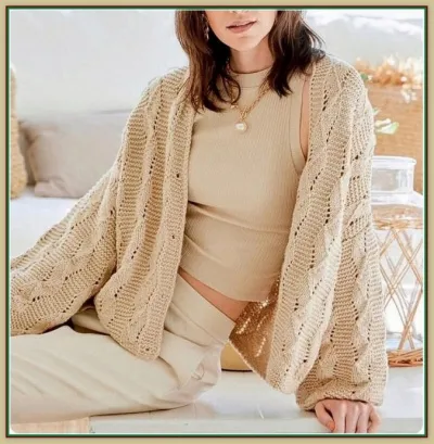 Выполнить плечевые швы. По 8 отложенных петель планок полочек вновь перевести на спицы № 4,5 и по внешнему краю прибавить по 1 п. и провязывать их, как кромочные =9 п. Затем связать по 5 см, продолжив работу по узору, петли закрыть и сшить концы планок. Затем вшить бейку в горловину спинки. Вшить рукава, выполнить боковые швы и швы рукавов. Пришить пуговицы.