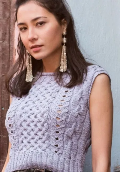 Короткий топ, жилет с плетеным узором спицами