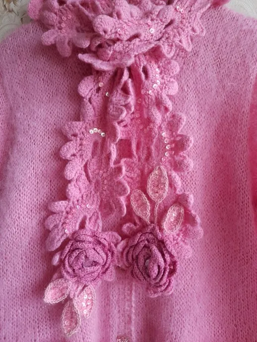 Пальто совсем простое, долго выбирала узор или ажур, но остановилась на лицевой вязке. Основное украшение - шарфик с розами, связанный ранее крючком ленточным кружевом из 100% шерсти и украшенный розами с листиками.