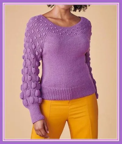 Джемпер с кокеткой вяжется сверху вниз по кругу, а объемные петли становятся все больше по направлению низа.