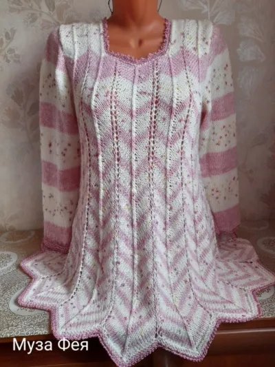 Связала новый пуловер, назвала его "Пастораль". Нежная бело-розовая расцветка, мелкие крапинки, напоминающие полевые цветочки, свободный расклешенный силуэт - создают пейзанский (пастушеский) образ.