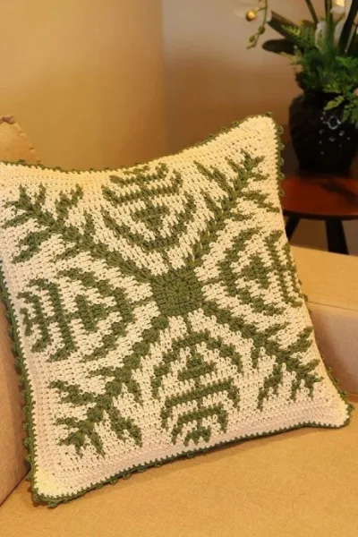 Подушка с узором в технике мозаичного вязания крючком