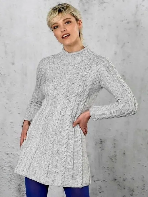 Вертикальный узор из кос в этом коротком платье визуально вытягивает фигуру.