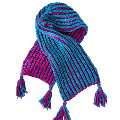 Повторять 1 и 2 ряды ЛС и ИС указанными цветами до размера шарфа 178 см / 70 д, закончив рядом ЛС КЦ.Закрыть петли используя нить КЦ следующим образом: 1 л, 1 бри, протянуть вторую петлю через первую на правой спице (одна петля закрыта). Продолжать так же, провязывая 1 л и 1 бри (сн п и нк), пока закроются петли.
