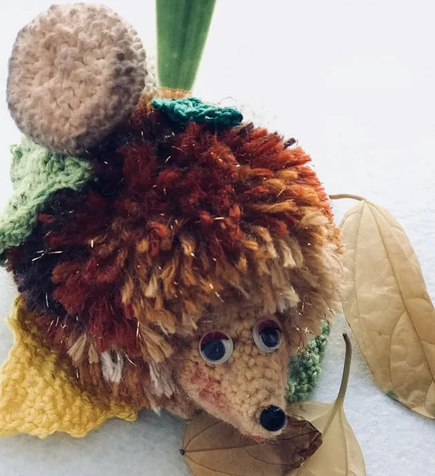 Осенний мотив. Солнце, яркие листики, паутинка и ёжик в травке с грибочком.