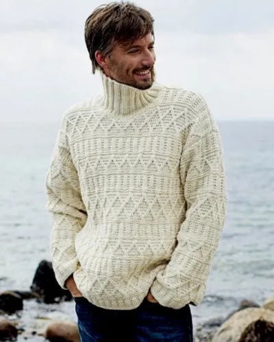 Свитер с высоким воротником и крупным рельефным рисунком не оставит равнодушным поклонника свободного стиля.