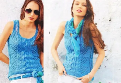 Сборка: выполнить плечевые швы. По вырезу горловины набрать на круговые спицы 134 п., связать 1,5 см резинкой и все петли закрыть по рисунку. По проймам набрать на круговые спицы по 80 (86) 92 п., связать для планок между кром. 1,5 см резинкой и все петпи закрыть по рисунку. Выполнить боковые швы, включая короткие края планок пройм.