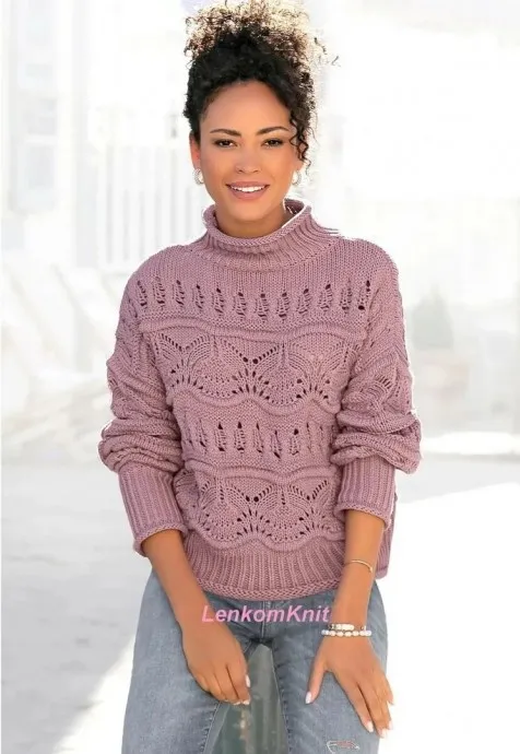 В этом джемпере самое интересное — его узоры. Чередуются два вида узоров, а между ними делается валик-защип.