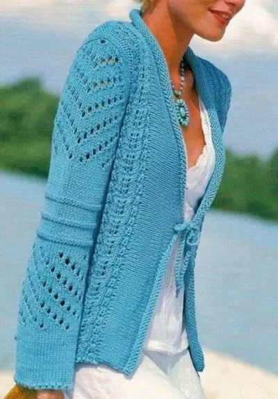 Ажурный бирюзовый жакет спицами