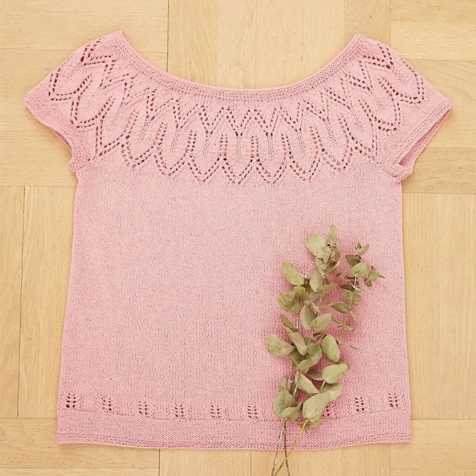 Замечательный зигзагообразный узор вдоль выреза горловины и деликатный ажур по низу топа смотрятся особенно впечатляюще в розовом цвете.