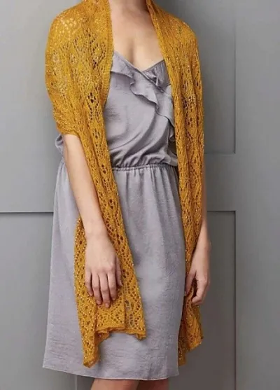 Палантин спицами ажурным узором, украшенный бусинами