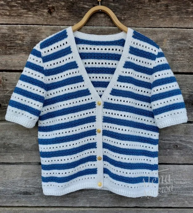 Эта кофточка выполнена в классической цветовой гамме морского стиля - сине-белой полоске. Такой простой и в то же время стильный узор придает изделию неповторимый морской вид, напоминая о летнем отдыхе на побережье.