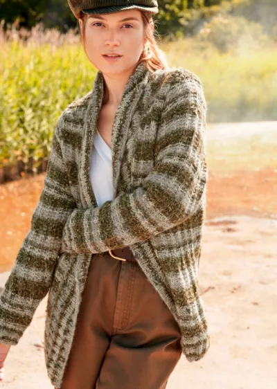 Рельефное вязание, объёмная резинка. Кардиган узором патронная лента.