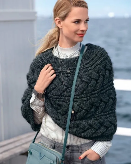 Пончо с узором из кос поперечного вязания