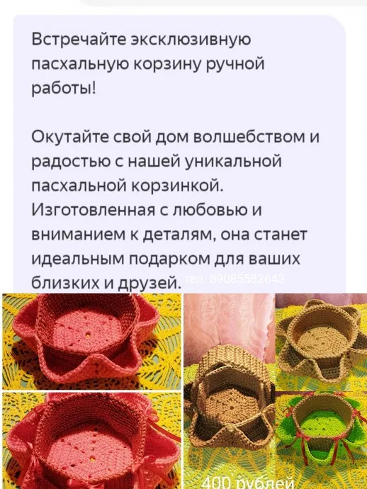 Корзиночки связаны из трикотажной пряжи. Дно деревянное.