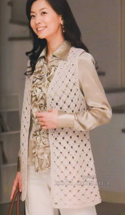 Этот длинный женский жилет вяжется крючком по схемам и согласно выкройке, приведенным ниже на картинках.