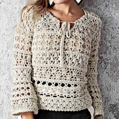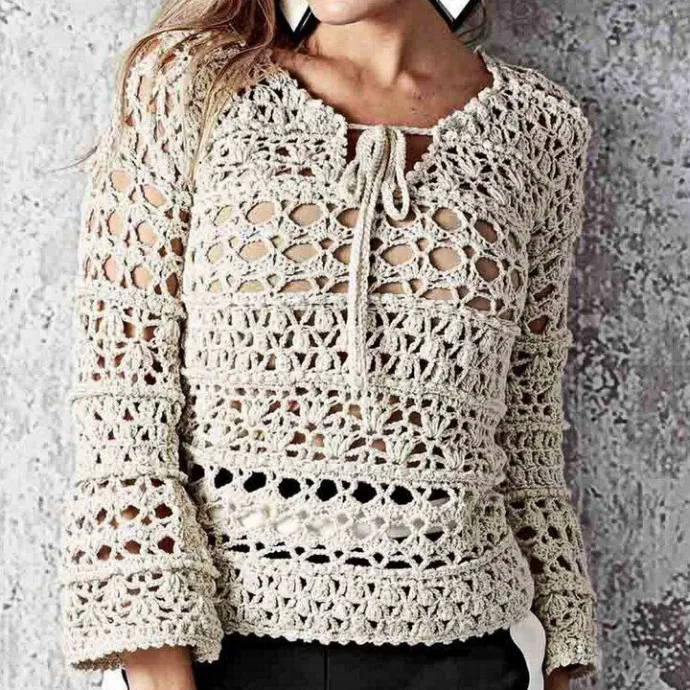 Кружевная блузка в стиле бохо натурального белого цвета.Прямой фасон с небольшим V-образным вырезом горловины на завязках.Вам потребуется:40% хлопок,50% акрил,100гр/150м.Крючок-3,5-4.