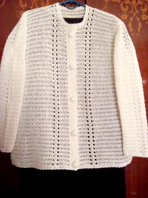 Весна активно вступила в свои права. Деревья в цвету. Тёплые деньки иногда сменяются прохладными, но солнышко работает активно. Вот и я решила не тянуть и связала себе к маю белую кофточку. Лежала у меня пряжа "Блюз". Лежала-лежала... и пришло её время. Взяла крючок и навязала. Ушло 400 гр.