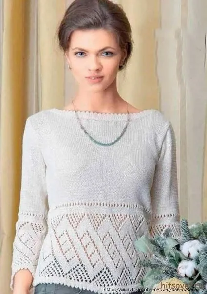 Вязаный джемпер с ажурной каймой со схемойАжурная кайма: вязать по схеме, на которой приведены только лицевые ряды, в изнаночных рядах накиды провязывать изнаночными. Провязать с 7-го по 58-й ряд.