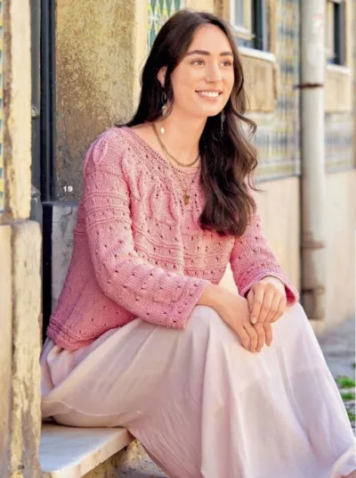 Просторный розовый пуловер связан сверху вниз единым полотном, а на кокетке чередуются полосы платочной вязки, ажура и декоративных «листьев».