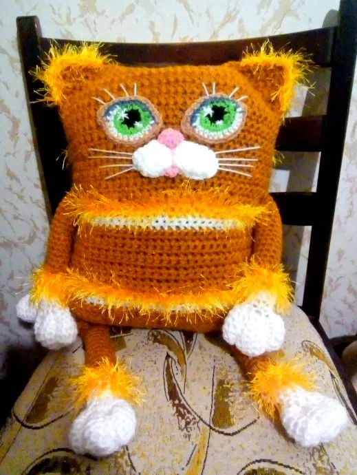 Закончила свою новую подушку-игрушку "Кот". Пока вязала, называла Рыжиком. Персонаж получился ярким.