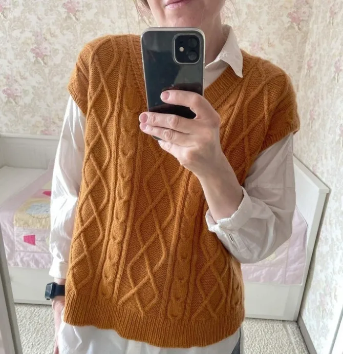 - Выбор модели и узора. Решите, какой именно фасон безрукавки вы хотите связать: классическая, с удлиненным силуэтом, с высоким или низким вырезом. Подберите узор – от простой лицевой глади до сложных аранов или ажурных узоров.