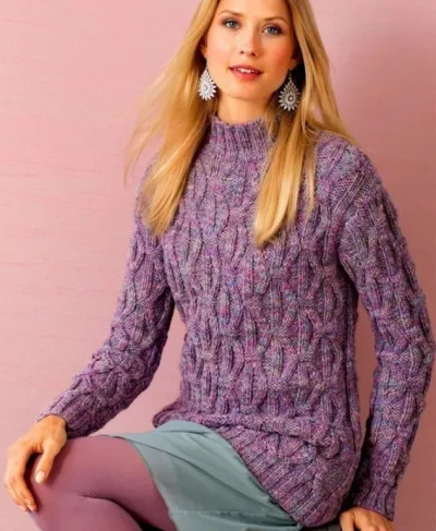 В этом свитере с воротником-стойкой выразительный рельефный узор удачно сочетается с меланжевой пряжей.