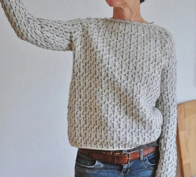 Пуловер SYDVESTER вяжется без швов сверху вниз жаккардовым мотивом со снятыми петлями. В начале вязания выполняется формирование горловины, затем продолжается вязание с прибавлениями по линиям реглана до момента разделения на туловище и рукава. Затем петли рукавов откладываются на бросовую нить, поднимаются петли для пройм, и вы продолжаете вязать туловище вниз до кромки. После того, как вязание туловища будет завершено, петли рукавов возвращаются на спицы и вяжутся рукава круговыми рядами вниз до манжет.