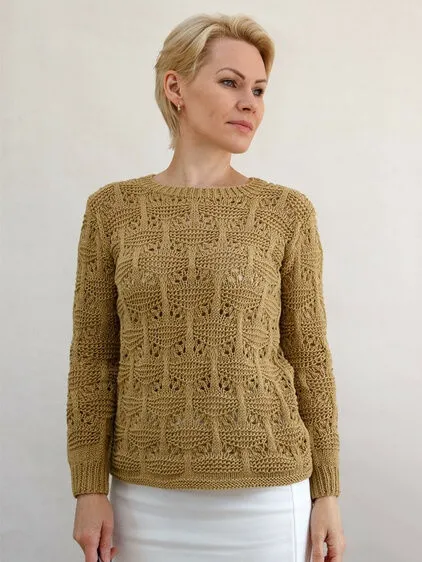 Через 56 см = 160 рядов (60 см = 172 ряда) от смены узора закрыть все петли, при этом средние 31 (39) п. образуют горловину, внешние по 19 (23) п. — плечи.