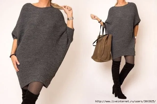 Вязаное платье оверсайз спицами с рукавами летучая мышь — идеально! Оно будет смотреться превосходно на любой фигуре. Его можно носить как тунику с брюками, лосинами или как платье. Вяжется достаточно просто и подойдет для начинающих мастериц.