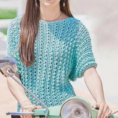 Для вязания этого пуловера нам понадобится 400 (450) г мятно-голубой пряжи: 40% модал, 30% полиамид, 15% кашемир, 15% шёлк; 100 м/50 г. Круговые спицы № 6,5 и крючок № 6.